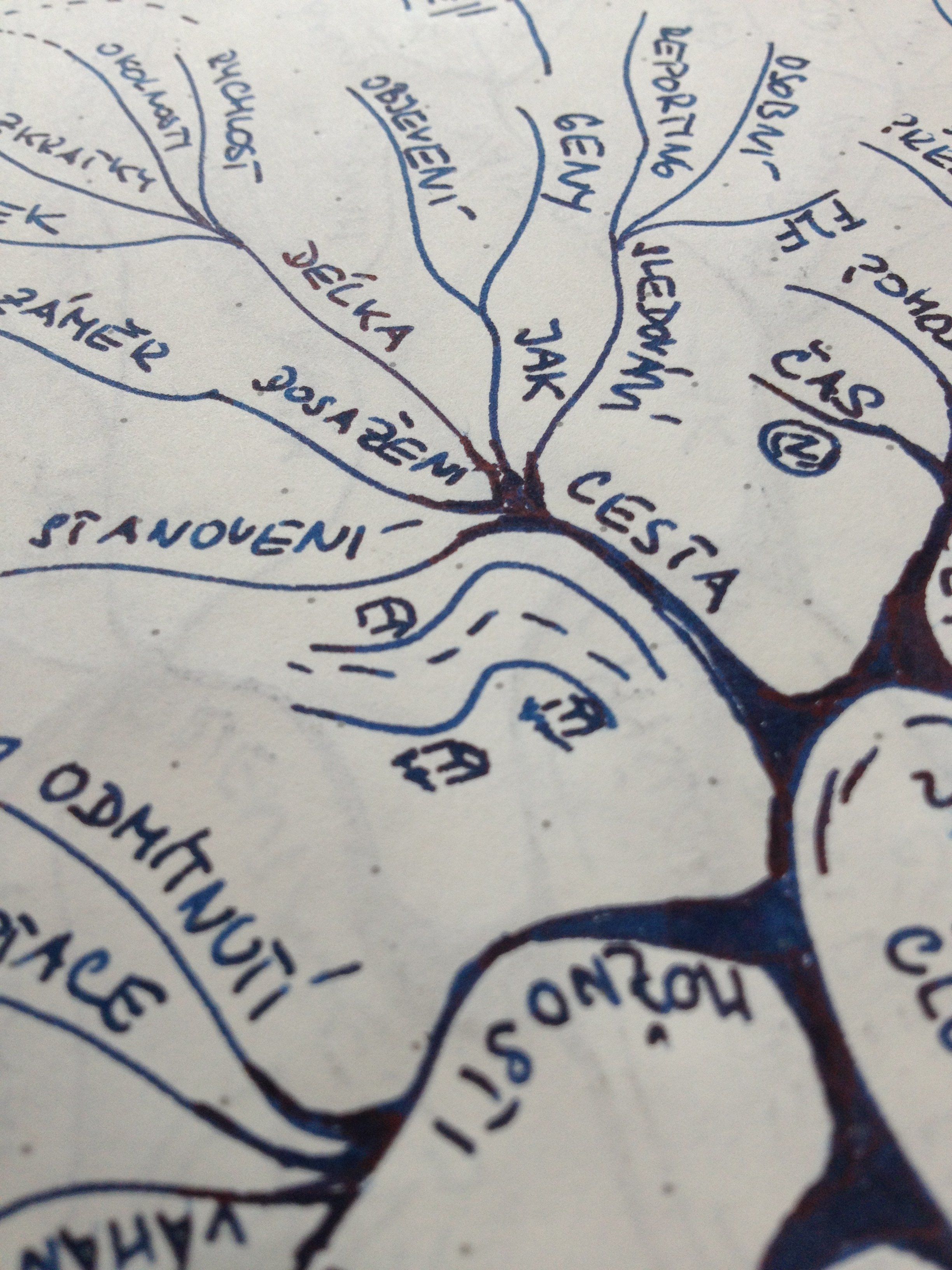 Pokud chci zvážit nové možnosti, popřemýšlet o projektu nebo třeba nechat vzniknout nové nápady, používám myšlenkové mapy. Při tvorbě těchto „přemýšlecích“ map sahám v naprosté většině situací po papíru. Papelote, čistou A4, účtenku nebo ubrousek – co je zrovna po ruce. Vzhledem k tomu, že mapa jako taková vzniká pod mýma rukama poměrně často, většinou i několikrát denně, podklady se často střídají. Tu jsem jen na skok v kavárně a nemám s sebou blok. Vezmu účtenku odloženou předchozím zákazníkem, pohledem zkontroluji útratu, požádám baristu o zapůjčení tužky a už si čmárám.